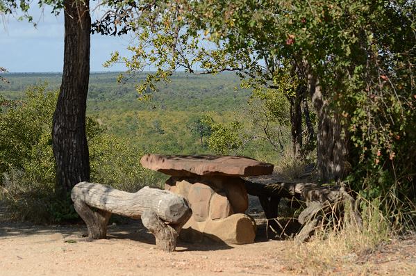 Dies ist wohl der ab gelegenste Platz in diesem Teil des Parks und man hat einen schönen Ausblick von hier in Richtung Südwesten auf den Tshanga River und über das Mopaneveld, unten auf dem Foto zu sehen. Im Mai war dort unten noch alles grün und wir machten eine kurze Rast am idyllischen Picknicktisch. Es gibt sogar eine Toilette hier, aber der Platz wird nicht bewirtschaftet und somit hat man hier meist seine Ruhe und findet Abgeschiedenheit. Wir waren jedenfalls die einzigen Gäste dort oben.