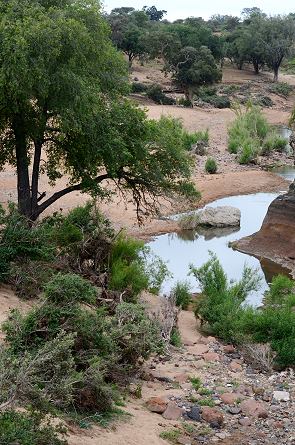 So blieb uns nichts als die Schleife am Fluss im Westen, die zum Camp Bateleur führt. Die ist allerdings wunderschön und führt immer nah am Fluss vorbei. Die Region hat uns so gut gefallen, dass wir für April 2014 gleich zwei Nächte Shingwedzi und zwei Nächte im Bush Camp Bateleur gebucht haben. Das letzte Teilstück der Strecke bis zum Rooibosrant Dam ist nur für die Gäste dieses Camps offen.