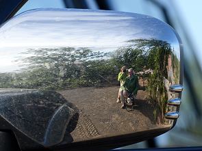 Tiere waren im Flussbett leider keine zu sehen, aber wir waren auch gegen Mittag hier. Von Bateleur aus lohnt sich die Region sicher mehr, wenn man früh am Morgen direkt vor Ort ist und auch am späten Nachmittag nicht mehr weit fahren muss, bevor die Eingangstore zu den Camps schließen. Wir machten noch ein Selbstportrait im glänzenden Rückspiegel und folgten dem Fluss weiter in Richtung Westen.
