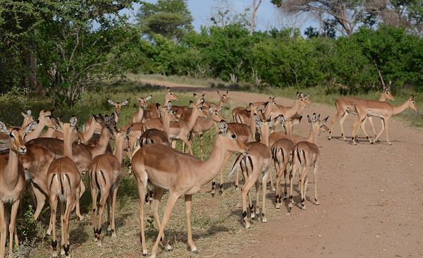 Der Red Rocks Loop, die S52, führt durch dichten Mopanewald immer am Flussufer entlang und wir waren hier fast alleine unterwegs. Im ganzen Norden gab es nur wenige Autos, weil ja nur noch zwei Camps geöffnet waren: Mopani und das kleinere Punda Maria. So konnten wir in Ruhe jede kleine Schleife abfahren, aber am Mittag sahen wir nur ein paar Warzenschweine, Impalaherden und Vögel im dichten Grün. Auffallend an diesem Loop sind die vielen alten und sehr unterschiedlichen Bäume am Wegrand. Am Ende der Strecke liegt der Rooibosrant Dam, den man aber nicht sieht. Nur als Gast des Bateleur Camp hat man eine Chance, denn das liegt am Ufer.