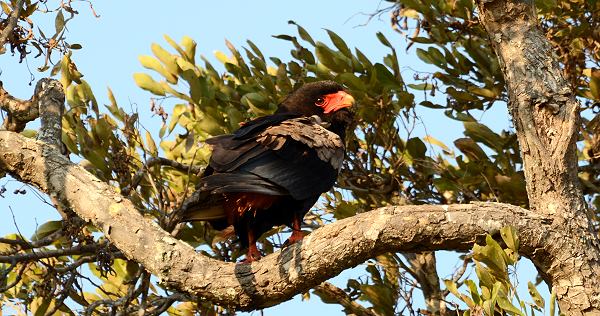 Erst nach einer ganzen Weile bemerkten wir über uns im Baum einen der hübschen Bateleur Adler (Terathopius ecaudatus), auf Deutsch wegen seines bunten Federkleids Gaukler genannt. Er hatte uns wohl schon die ganze Zeit beobachtet und gleichzeitig die Ebene bis zum Wasserloch im Blick.