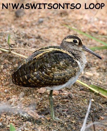 Im Mai sind wir die Strecke gleich zwei Mal gefahren, einmal auf dem Weg vom Süden in Richtung Orpen Camp. An diesem Tag hatten wir dann noch einmal das Glück gepachtet, denn eine weitere seltene Begegnug, die weiter unten beschrieben ist, machte diese Strecke endgültig zu unserer Lieblingsstrecke im Park. Auch eine eher seltene Schnepfe, oben auf dem ersten Bild zu sehen, sieht man nicht alle Tage im Park.