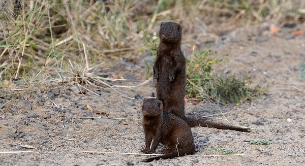 Wie Erdmännchen stellen sich Mangusten gerne auf die Hinterbeine, wenn sie Gefahr wittern. Das konnte ich schön fotografieren, denn wir kamen nah an die Tiere heran. In den Camps sind die zwar weniger scheui, dafür fotografiert man sie dort immer in urbaner Umgebung mit Terppenstufen oder Mauerwerk im Hintergund. Hier in freier Wildbahn sind sie schwieriger, aber weitaus schöner zu fotografieren.