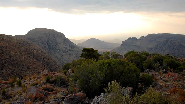 Es gibt viele Raubvögel in der Luft zu bewundern und nach einer Weile erkennt man oben auf der Höhe eine Ansammlung von Funkantennen. Genau dort endet die Straße, doch zuvor hat man noch schöne Ausblicke auf die umliegenden Waterberge und in weitere, tiefe Täler auf der anderen Seite. Das Licht wurde immer schöner und goldener. Hier oben ist man wohl auch in der Nähe der berühmten Geierkolonie und diese großen Vögel schweben mit Glück hautnah vorbei - leider nicht bei unserem Besuch. Nur ein paar kleine Punkte waren am Himmel zu sehen.
