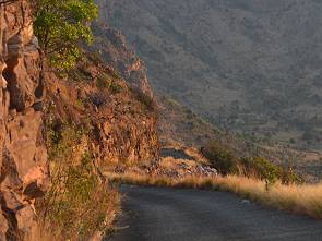 Eine schmale und sehr enge Straße führt hoch hinauf bis auf die Spitze des Waterberg-Massivs. Aufgrund der Steigung ist diese Strasse geteert. Die Aussichten ins Tal und die umliegenden Landschaften sind spektakulär und es wird immer steiler und enger. Am späten Nachmittag kamen uns nur 2 Fahrzeuge entgegen, danach waren wir ganz alleine dort oben.