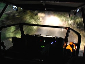 Das Fahrzeug war rechts und links am Dach mit LED-Strahlern ausgestattet, das hatten wir bisher noch nicht gesehen. So wurde die Landschaft auf beiden Seiten der Fahrspur während der Fahrt ziemlich weit angeleuchtet. Zusätzlich schwenkte unser Fahrer bei Bedarf noch einen Suchscheinwerfer, um auch weiter entfernte Tiere und aufblitzende Augen zu entdecken.