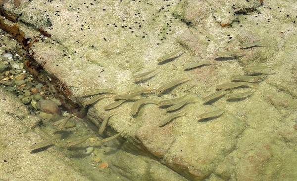 Auf der anderen Seite vom Ort, vorbei an zahlreichen Freienhäusern, dem Hafen und dem kleinen Ortszenztrum, findet man eher eine Küste mit Felsen, wo das Meer sich bei Ebbe in geschützten Felsbecken zurückzieht. Das Wasser ist klar, während rundherum die Brandung gegen die Felsen schlägt. In den Pools entdecken wir kleine Fische, Krebse und Muscheln, während Möwen, Kormorane und Austernfischer über unsere Köpfe fliegen.