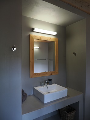 Die beiden Schlafzimmer haben jeweils ein angrenzendes Bad, einen eigenen Ofen und eine eigene Terrasse. Im Zimmer mit den zwei Einzelbetten standen unsere Koffer und Kleidung; im anderen Zimmer mit großem Doppelbett haben wir sehr gut geschlafen.