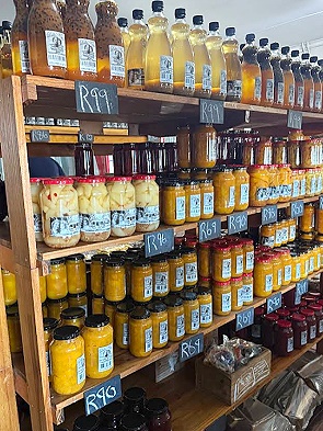 Im Inneren findet man eine Menge hausgemachter Produkte einer nahen Farm: Marmeladen, Senf, Essig, Chutneys, eingemachte Gemüse und Sossen. Da wir schon bei Brenda´s in Paarl eingekauft hatten, haben wir hier nur aufgestockgt mit lecker eingelegten Zwiebeln, Ananas-Chutney und Curry-Bohnen und sehr guten Plätzchen. Später haben wir uns geärgert, davon nicht mehr mitgenommen zu haben.