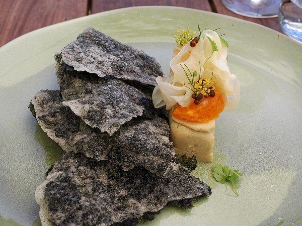Wir begannen mit Springbock-Tataki für Michael, das war wunderbar dekoriert mit einer Rolle Tête de Moine Käse on Top. Ich hatte Fisch und mich für das geräucherte Snoek-Parfait entschieden, mit Fenchel, Mandarine und sensationellen Nori-Reiscrackern. Super lecker!