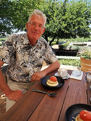 Nach dem ersten Besuch im Jahr 2024, der uns begeisterte, waren wir auch diesmal wieder zum Lunch im Kapokbos. Die Kellner kannten wir noch, auch das Ambiente hatte sich nicht verändert, nur die Chefin war schwanger. Wir bekamen wieder einen schönen Tisch auf der Terrasse mit Blick auf den Rosengarten. Da wir an einem Sonntag hier waren, waren Tasting und Verkauf geschlossen, so dass es noch entspannter war.