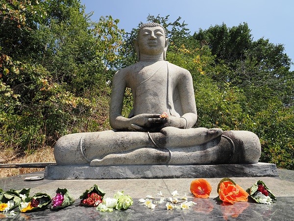 Es ist ein Ort der absoluten Ruhe, an dem nur der Wind und das ferne Läuten der Tempelglocken zu hören sind. Hier steht auch noch eine neuere Buddha-Statue, vor der die Gläubigen blühende Opfergaben abgelegt hatten. Ein wunderschönes Motiv.