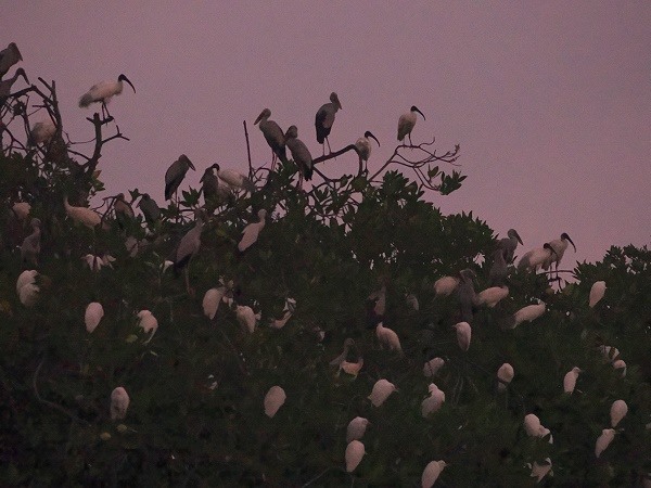 Die Lagune ist ein Paradies für Birdwatcher. Man findet hier Eisvögel, Reiher, Kormorane und den majestätischen Weißbauch-Seeadler. Erste Anlaufstelle war ein Uferbereich, in dessen Bäumen unzählige Reiher, Ibisse, Kormorane und Klaffschnabelstörche übernachten. Sie erwachten gerade, doch leider war es noch etwas zu dunkel für gute Fotos. Die beiden Männer paddelten weiter, nachdem wir es wenigstens versucht hatten, die friedliche Stimmung im Bild festzuhalten.