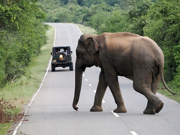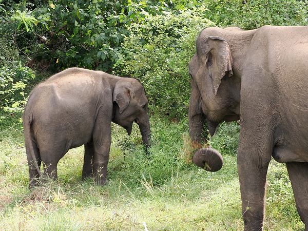 Nachdem wir das Nationalpark-Tor hinter uns gelassen hatten, war die Safari jedoch noch nicht zu Ende. Da es bereits zu dämmern begann, begegneten wir auf der öffentlichen Straße (B35) zwischen Buttala und Kataragama weiteren Elefanten, die sich im schwindenden Licht das Asphaltband als bequemen Weg ausgesucht hatten.