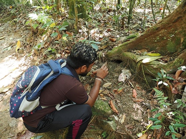 Für eine wahre Rarität und ein Highlight für Fotografen mussten wir über einen schmalen Weg steil nach oben klettern. Prabath war am Telefon und ließ sich von einem Freund leiten, während er im Blätterwald suchte. Dann hatten wir den Vogel der Begierde gefunden: Das Sri-Lanka-Froschmaul (Batrachostomus moniliger), im Englischen Sri Lanka Frogmouth, ist wohl einer der am schwersten zu entdeckenden Vögel im Sinharaja-Wald. Er ist ein naher Verwandter der Nachtschwalben und ein absolutes Highlight für jeden Naturbeobachter, da er die Kunst der Tarnung zur Perfektion getrieben hat. Dieser Vogel ist so perfekt als abgebrochener Ast getarnt, dass man oft direkt an ihm vorbeiläuft, ohne ihn wahrzunehmen.